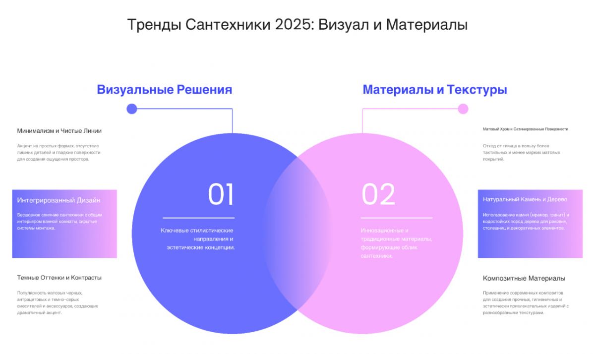Глянцевые поверхности постепенно сдают позиции, уступая место тактильно приятным материалам. Это связано не только с эстетикой, но и с практичностью: на матовой арматуре или элементах для зоны гигиены с PVD-покрытием меньше заметны известковый налет и отпечатки пальцев. В этом году наблюдается тренд на «тотальный цвет», когда керамика и фурнитура подбираются в единой гамме, отличной от белой. Черные унитазы и раковины из искусственного камня темных тонов перестали быть экзотикой.